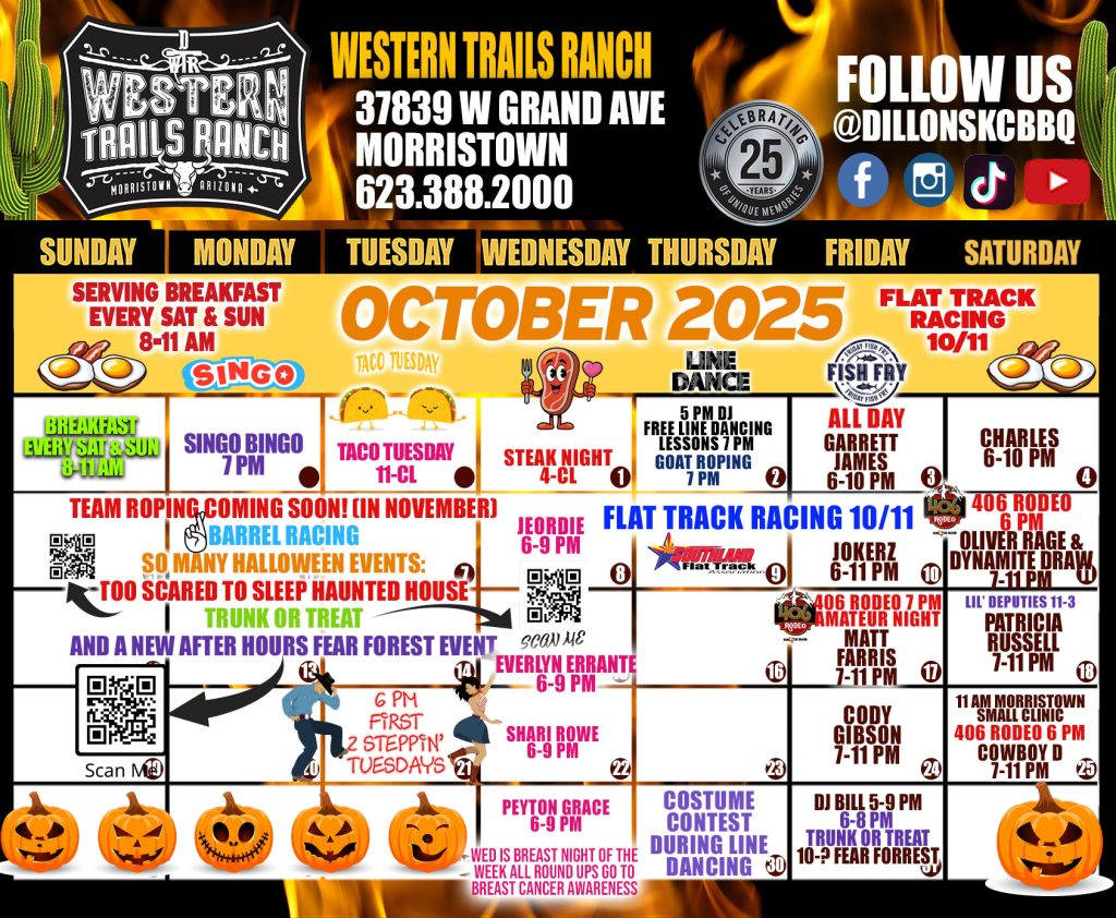 Dillon’s at Western Trails Ranch is our newest location and sits on 12 acres of property. Just 13 miles Northwest from the 303 ON THE US60, this new location will not let you down! Join us for live entertainment every weekend with Country music, Rock-N-Roll Tribute bands and more!