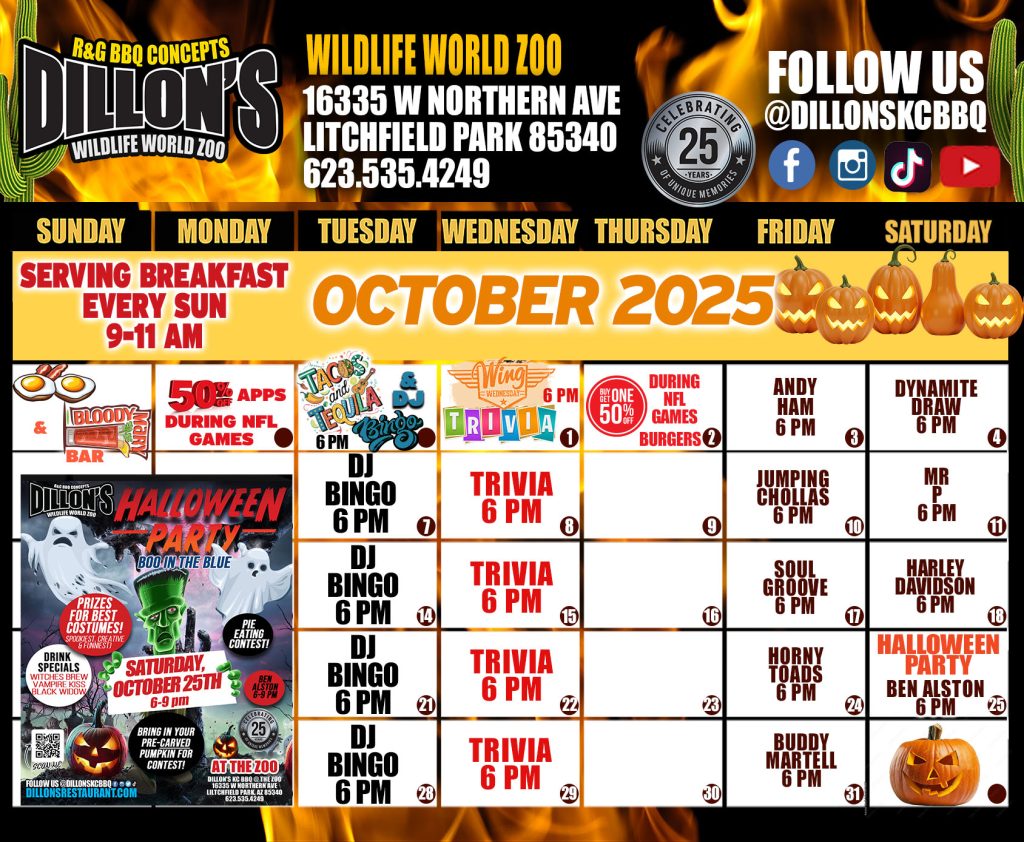 DILLON’S WILDEST LOCATION is located on Northern, 8 miles west of the 101, the Wildlife World Zoo & Aquarium allows you to dine with the sharks! That’s right! You’ll be eating beside a beautiful 60,000 gallon shark tank, or enjoying a vibrant flamingo exhibit on our patio. Whether you’re in the west valley for lunch, dinner, weddings, anniversaries, corporate outings or parties, Dillon’s at the Wildlife World Zoo and Aquarium can accommodate you. Be inventive and enjoy a new experience today. And, don’t worry, no entrance fee is required for dining with us!
